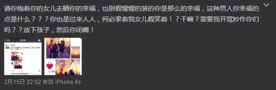 이어 그는 16일 오전 또 다시 웨이보에 "자기 딸도 있으면서 그 사진은 안 올리고 내 딸이랑 행복 놀이를 해? 대단하다. 대단한 계략에 내가 무릎 꿇었다"며 "내가 아이 문제는 마음속에서 지우지 못하는 것도 알고, 왕펑에게 둘째 딸도 있는 걸 알지 않느냐! 대체 왜?! 내 전 남자와 나의 아이를 데리고 행복을 과시하는 건지?"라고 격분했다.