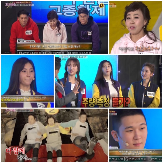 28일 오전 방송된 KBS 2TV 예능프로그램 '출발 드림팀 시즌2'(이하 '드림팀')는 '삼일절 특집 슬라이딩 역사 퀴즈쇼'로 꾸며며 트로트 가수팀 이애란 박상철 박구윤, 건강 미녀팀 예정화 구지성 맹승지, 배우 패밀리팀 박준규 진송아 박종혁이 출연했다.