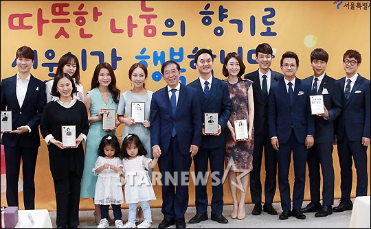연예방송[★포토]'서울시 위해 모인 ★들'발행 : 2016.05.03 ・ 13:33김창현 기자개그맨 박수홍, 배우 이하나, 이일화, 가수 슈, 박원순 시장, 장현성, 최현정 아나운서, 스윗스로우, 라둥이, 성우 서혜정(왼쪽 위 시계방향)이 3일 오후 서울시청에서 진행된 '서울시 홍보대사 위촉식'에서 포즈를 취하고 있다.<저작권자 © 스타뉴스, 무단전재 및 재배포 금지>서울시 홍보대사추천 기사김창현 기자기자홈좋아요 연예-방송의 인기 급상승 뉴스연예-방송의 최신 뉴스