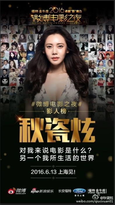 추자현은 지난 1일 자신의 웨이보(SNS)에 중국 시상식 '웨이보의 밤'에 출연한다고 밝히며 포스터를 게재했다.