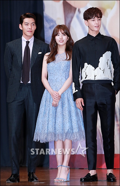 배우 김우빈, 배수지, 임주환이 4일 오후 서울 용산구 한남동 그랜드 하얏트 서울 호텔에서 열린 KBS 2TV 수목드라마 '함부로 애틋하게' 제작발표회에 참석해 포즈를 취하고 있다.