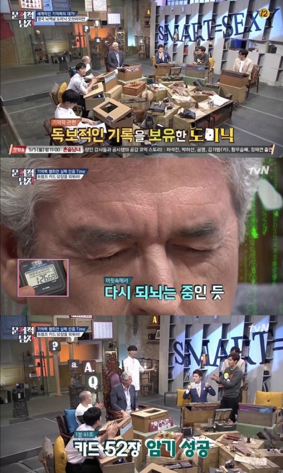 1분42초라는 시간 동안 52장을 외우는데 성공한 도미닉은 자신만만하게 암기를 해나갔고 모두 맞히는데 성공해 뇌섹남들을 경악시켰다. 도미닉은 "각각의 카드에 코드를 매겨 이미지화 해서 외운다"고 설명했다.