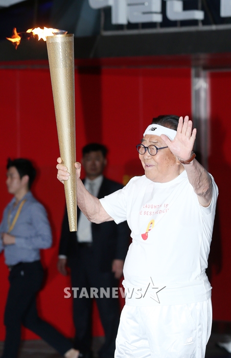 방송인 송해가 26일 오후 부산 해운대구 영화의전당에서 진행된 '제4회 부산국제코미디페스티벌' 블루카펫 행사에서 성화봉송을 들고 참석하고 있다.