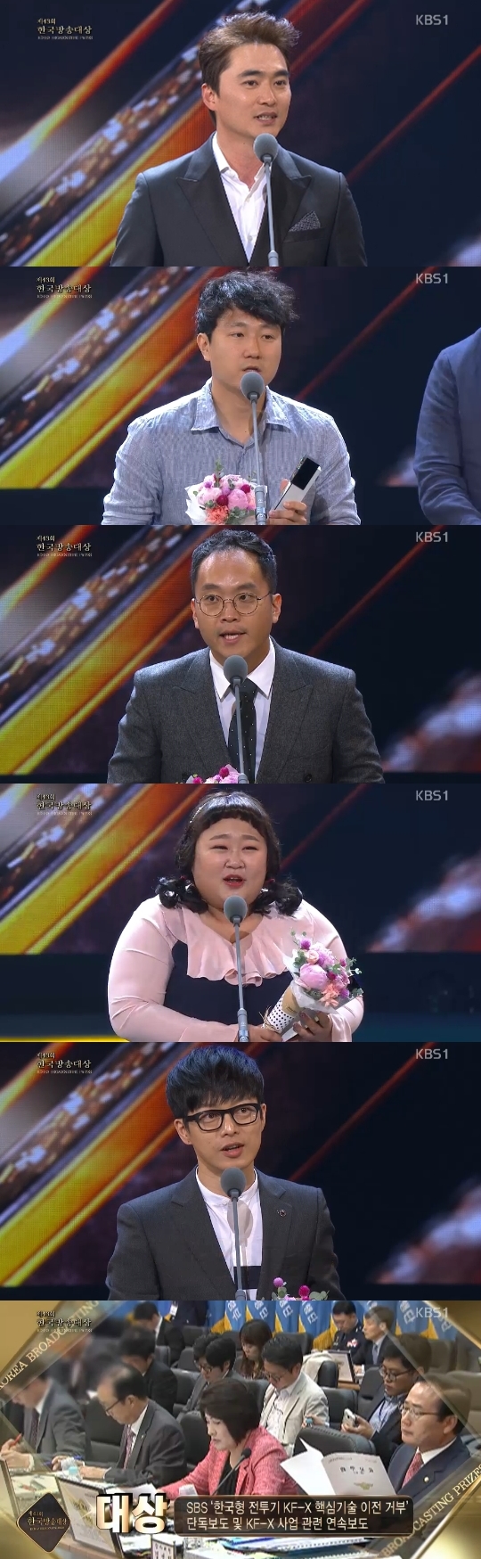 SBS '한국형 전투기 KF-X 핵심기술 이전 거부' 단독보도 및 KF-X 사업 관련 연속보도가 제43회 한국방송대상 시상식에서 대상을 수상했다. 황정음과 하현우는 각각 연기자상과 가수상에 이름을 올렸다.