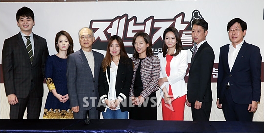 소재원 소설가, 류은희 기자, 강지원 변호사, 문지혜 PD, 황선기 변호사, 양지민 변호사, 김진구 프로파일러, 박복용 담당(왼쪽부터)가 6일 오전 서울 영등포구 여의도동 한 음식점에서 열린 KBS 2TV 시사교양 프로그램 '제보자들' 기자간담회에 참석해 포즈를 취하고 있다.
