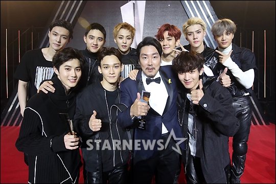 그룹 엑소와 배우 조진웅이 16일 오후 서울 동대문구 회기동 경희대학교 평화의전당에서 열린 '2016 Asia Artist Awards(AAA)'에 참석해 AAA 대상을 수상한 뒤 포즈를 취하고 있다.
