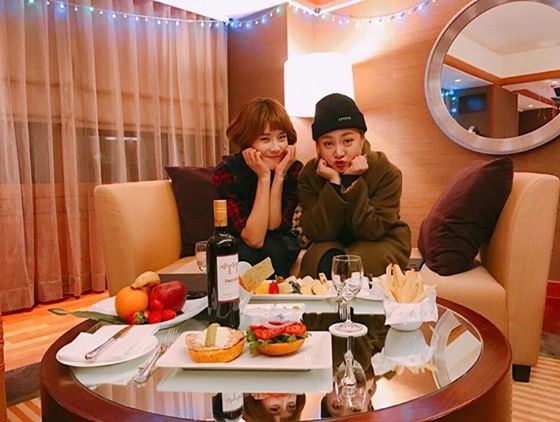 사진 속 박나래와 장도연은 호텔방에서 여유로운 한때를 보내는 모습이다. 이들의 앞에는 와인과 갖가지 안주가 곁들여져있고, 박나래와 장도연은 편안한 차림으로 귀여운 표정을 짓고 있다.