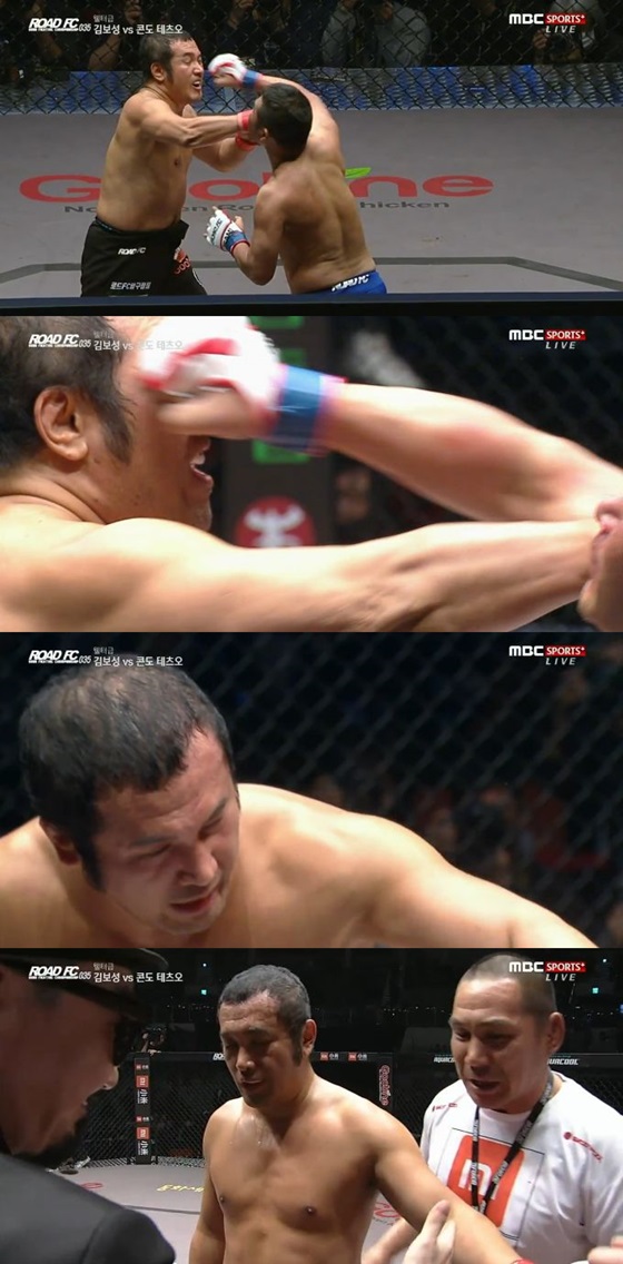 김보성은 10일 오후 11시께 서울 장충체육관에서 열린 종합격투기대회 로드FC 035(ROAD FC 035) 스페셜 매치 웰터급에 출전, 일본의 콘도 테츠오(48)와 대결했다.