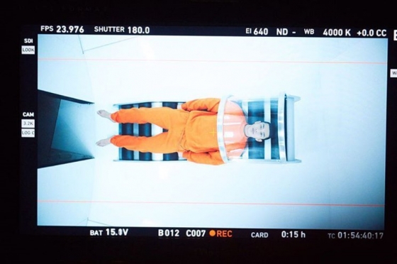 유아인이 올린 사진은 영상을 담고 있는 카메라 프레임이다. 유아인은 새하얀 바탕에 주황색 추리닝을 입고 누워있다. 신비로운 분위기를 풍긴다.