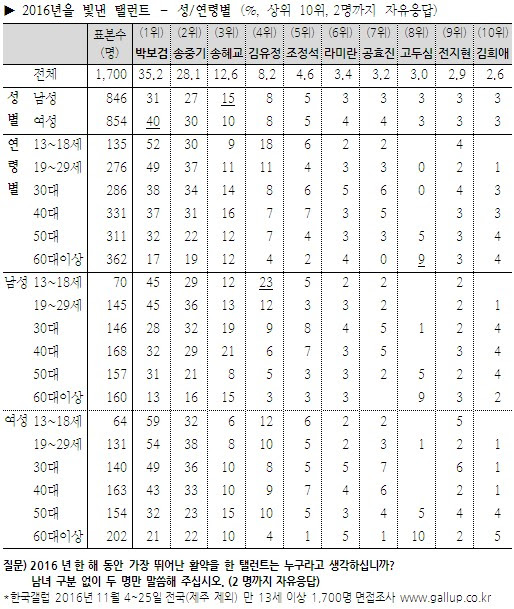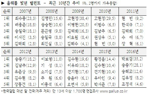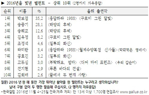 14일 한국갤럽에 따르면 한국갤럽이 지난 11월 4일부터 25일까지 3주간 전국(제주 제외)의 만 13세 이상 남녀 1700명을 대상으로 올 한 해 가장 뛰어난 활약을 한 탤런트를 두 명까지 물은 결과(자유응답), KBS 2TV '구르미 그린 달빛'의 남녀 주인공 박보검(35.2%)과 김유정(8.2%)이 각각 1위와 4위를 차지했다.