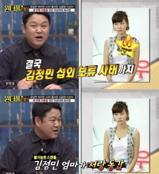 김구라는 "PD가 방송에 김정민을 섭외 하려 했는데 나 때문에 섭외 보류까지 했더라"라며 "김정민의 어머니가 나랑 동갑인데 무슨 말도 안 되는 소리"라며 열애설을 부인했다.