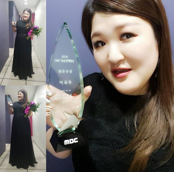 이와 함께 수상 직후 찍은 한 장의 사진을 게재했다. 사진 속 이국주는 최우수상 트로피를 들고 행복하게 웃고 있다. 이날 그녀는 검은 드레스를 입고 머리를 길게 풀어 내려 여성스러움을 한껏 드러냈다.