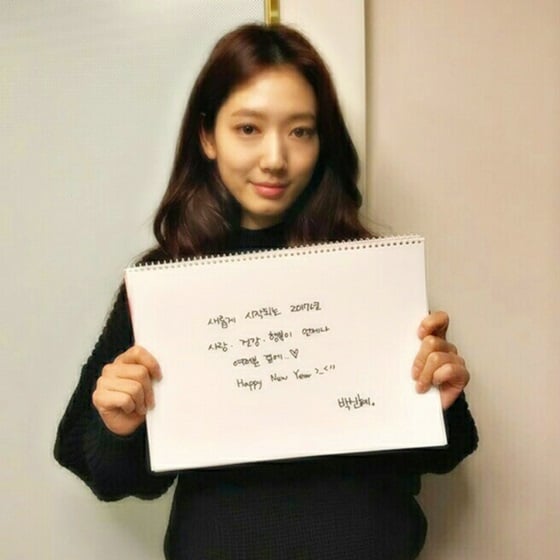 사진 속 박신혜는 동글 동글 예쁜 글씨로 "새롭게 시작되는 2017년, 사랑·건강·행복이 언제나 여러분 곁에, Happy New Year"라고 적은 스케치북을 들고 미소를 짓고 있다.