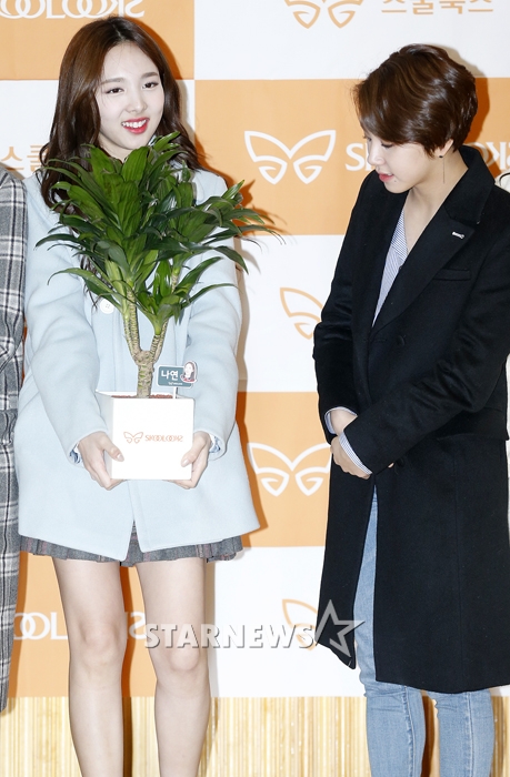 걸그룹 트와이스 나연, 채영이 1일 오전 경기도 안성시 한겨레 중고등학교에서 진행된 탈북 청소년 교복 후원식 '스쿨룩스 희망 더하기 캠페인' 행사에 참석해 포즈를 취하고 있다.