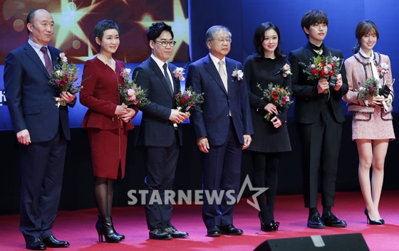 배우 윤주상, 정애리, 가수 김연우, 중앙선관위 김용덕 위원장, 배우 장나라, 그룹 B1A4 산들, 배우 진세연이 1일 오후 경기도 과천시 과천시민회관에서 진행된 '아름다운 선거 홍보대사 위촉식'에 참석해 위촉패를 전달받은 뒤 포즈를 취하고 있다.
