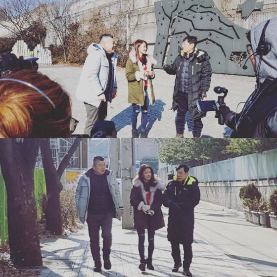 사진 속 이시영은 개그맨 강호동, 이경규와 함께 있다. 이들은 JTBC 예능 프로그램 '한끼줍쇼'를 촬영 중에 있다. 추운 날씨를 증명하듯 이들은 각자 두꺼운 패딩을 입고 촬영을 강행 중이다.