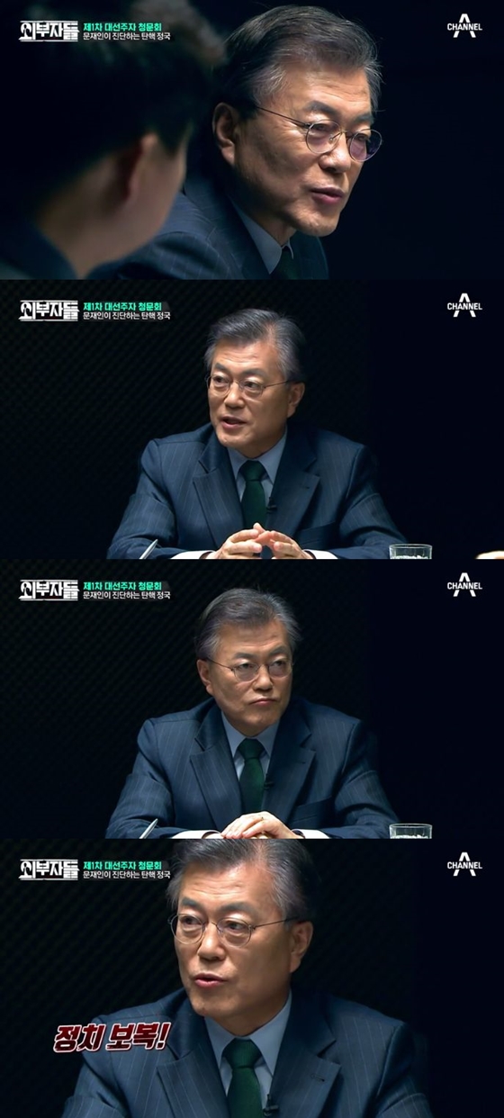 7일 방송된 채널A '외부자들'에서는 제1차 대선주자 청문회 첫 주자로 현재 대선 후보 지지율 1위를 달리고 있는 문재인 상임고문이 출연했다. 문 상임고문은 자신을 "더불어민주당 필승 카드"라고 소개하며 이야기를 풀어갔다.