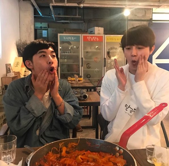 사진 속 맹세창과 최성민은 입을 벌리고 볼을 두들기는 등 장난스러운 모습을 보이고 있다.