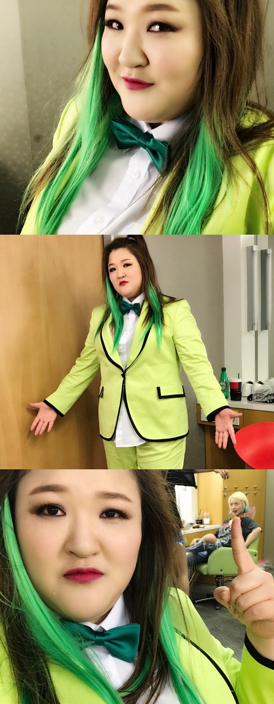 공개된 사진 속 이국주는 연두색 브릿지 머리스타일과 함께 노란색 정장 패션으로 눈길을 끌었다. 이국주 손가락 끝으로는 개그우먼 안영미가 개성 넘친 표정을 짓고 있어 웃음을 자아냈다.