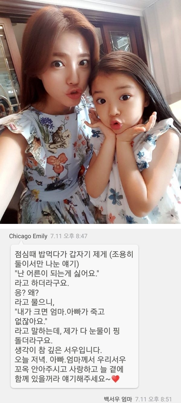 사진은 백서우의 담임 선생님이 정시아에게 보낸 문자 캡처 화면이다. 문자에는 "점심 때 밥 먹다가 갑자기 제게 '난 어른이 되는 게 싫어요'라고 하더라고요. '응? 왜?'라고 물으니 '내가 크면 엄마, 아빠가 죽고 없잖아요'라고 말하는데 제가 다 눈물이 핑 돌더라고요. 생각이 참 깊은 서우입니다. 오늘 저녁 아빠, 엄마께서 우리 서우 꼬옥 안아주시고 사랑하고 늘 곁에 함께 있을 거라 얘기해주세요"라고 적혀 있다.