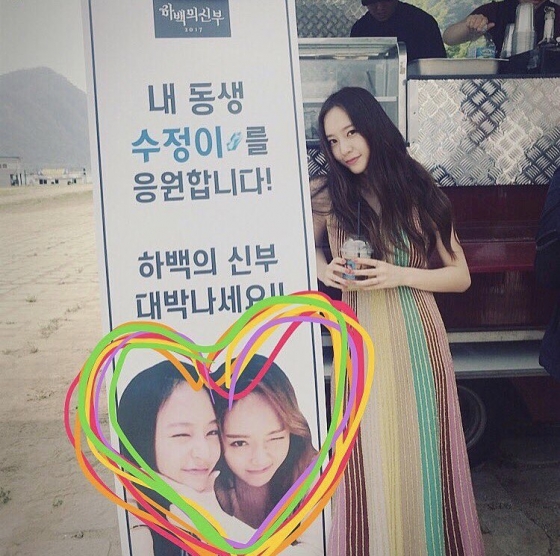사진 속 크리스탈은 커피를 들고 제시카가 보낸 "내 동생 수정이를 응원합니다! 하백의 신부 대박나세요!!"라는 글과 자매의 사진을 넣어 만든 간판 옆에 서 있다.