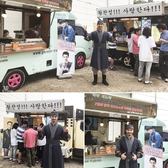 JYP엔터테인먼트는 지난 17일 공식 SNS에 "'7일의 왕비' 황찬성, 우영-윤박 서포트에 함박웃음! JYP의 끈끈한 우정!"이라는 문구와 함께 사진을 게재했다. 사진 속 황찬성은 커피차와 분식차 앞에서 환한 미소를 지어 보이고 있다.