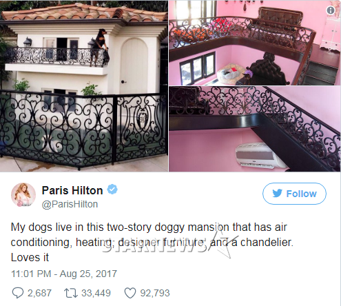 패리스 힐튼은 최근 자신의 SNS(소셜네트워크서비스)에 "강아지가 사는 2층 저택에는 에어컨디션과 난방시설이 설치되어 있으며, 디자이너가 설계한 가구와 샹들리에도 있다"며 애견 저택 사진을 공개했다.