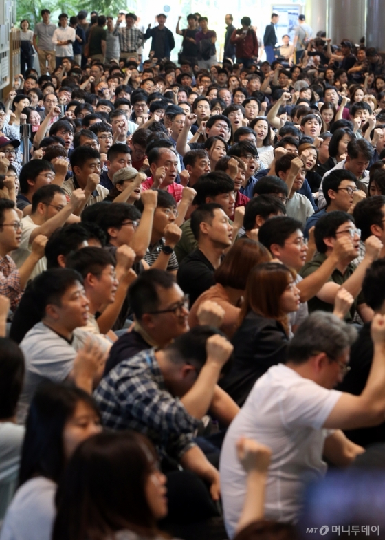 4일 오전 10시 상암MBC 로비에서 MBC노조 총파업 출정식이 진행됐다. 한 시간 넘게 진행된 이날 행사에서는 노조집행위원들의 선언과, 영상상영, 노래패의 노래 행사 등이 진행됐다.