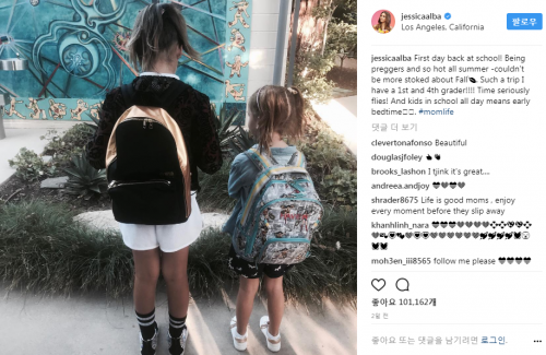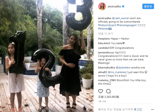 인스타 그램 속에서 제시카 알바는 두 딸 헤이븐 가너 워렌과 아너 워렌과 함께 숫자 1,2,3 모양의 풍선을 들고 임신을 축하하고 있다.