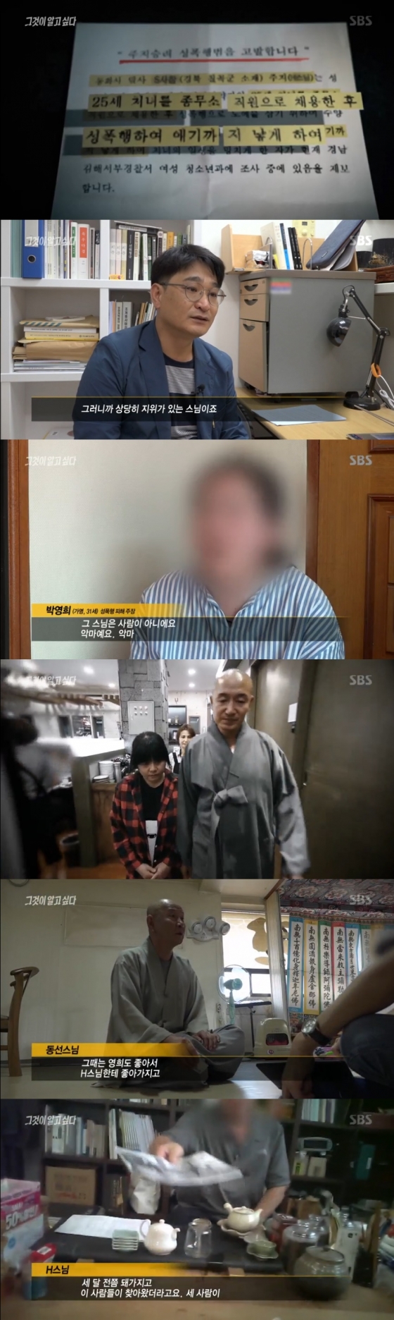 14일 오후 방송된 SBS '그것이 알고 싶다'에서는 주지스님에게 성폭행을 당했다고 주장하는 피해자를 만났다. 피해자는 문제의 스님이 충격적인 일을 저질렀다고 주장했다. 한편에서는 모녀가 돈을 노리고 거짓말을 하는 주장도 이어졌다.