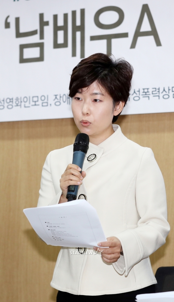 여성영화모임, 한국여성 민우회 등이 참여한 여배우 B씨에 대한 조덕제 성폭력 대책위원회 조인섭 변호사가 24일 오전 서울 중구 변호사회관에서 '남배우 A 성폭력 사건' 항소심 유죄 판결 환영 기자회견을 열고 입장을 발표하고 있다.