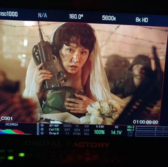 사진 속에는 얼굴에 때를 묻힌 김현숙이 웨딩드레스를 입고 군모를 들고 있는 모습이 담겨 있다. 마치 전쟁 현장에 있는 것 같은 모습이다.