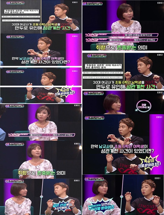 24일 '까칠남녀' 제작진은 "논란에 휘말린 EBS '까칠남녀-예쁜 소녀 찾습니다' (9월 25일 방송분) 편은 걸 그룹의 성 상품화 및 성적 대상화 문제에 대해 다루고, 아동 대상 범죄의 심각성을 알리는 토론을 진행했습니다"라며 "해당 방송에서 이현재 교수는'미성년자 의제 강간은 당연히 똑같이 처벌을 받아야 한다'라고 언급하고 있으며, 아동 성범죄를 두둔하거나 옹호하고 있지 않습니다"라고 말했다.