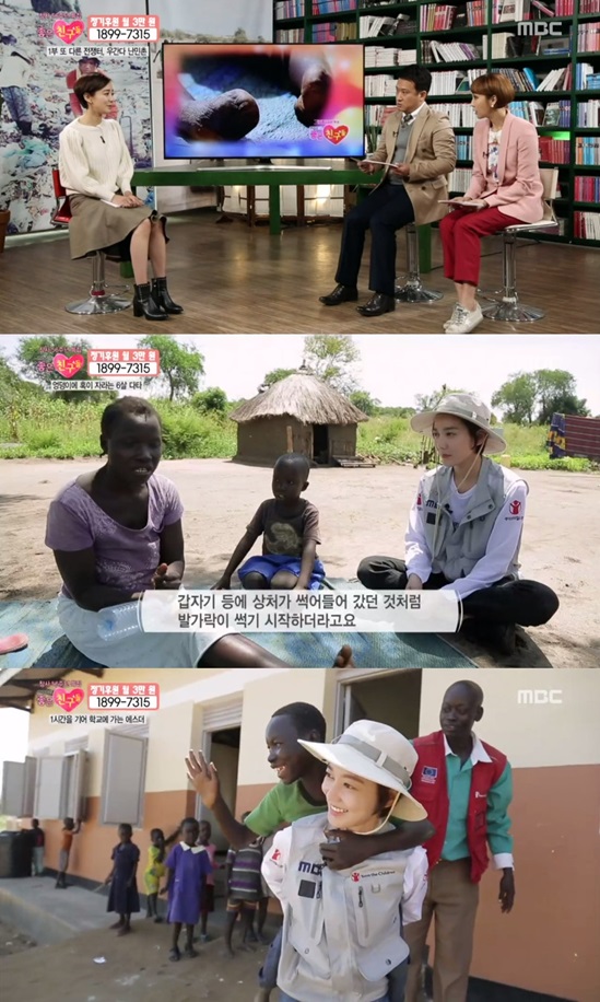 29일 방송된 'MBC와 좋은친구들' 1부 '또 다른 전쟁터, 우간다 난민촌'은 전쟁을 피해 우간다 북부로 모인 남수단 난민들의 이야기를 담았다. 이곳에는 배우 이소연이 동행해 때로는 언니처럼, 때로는 친구처럼 교감하며 난민촌의 아픈 사연을 생생하게 전달했다.