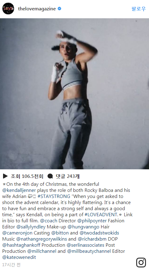 잡지 '러브'측은 또한 공식 인스타그램에서 "켄달 제너는 록키 발보아와 부인 아드리안의 역을 맡아 놀라운 움직임을 보여준다"며 촬영장면을 포스팅했다. 켄달 제너 역시 "캘린더 촬영을 부탁받았을 때 매우 기뻤다. 강한 내 자신과 함께 즐거운 시간을 보낼 수 있었다"고 전했다.