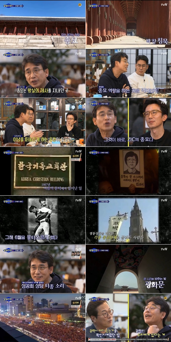 이어 "광화문 광장이나 탑골 공원이 유명하다. 사람들은 못 느끼겠지만 나한테는 되게 중요한 종묘 같은 공간들이 있다"며 자신의 '종묘'를 소개했다. 유시민이 1980년대 어마어마한 핫플레이스였다며 소개한 그 곳은 한국기독교회관. 이밖에 기독교회관, 명동성당 등이 언급됐다 .