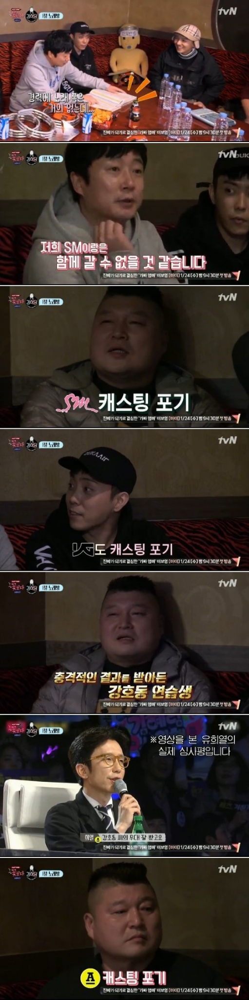 강호동의 노래에 SM의 이수근과 YG의 은지원이 '캐스팅 포기'를 외쳐 웃음을 자아냈다.