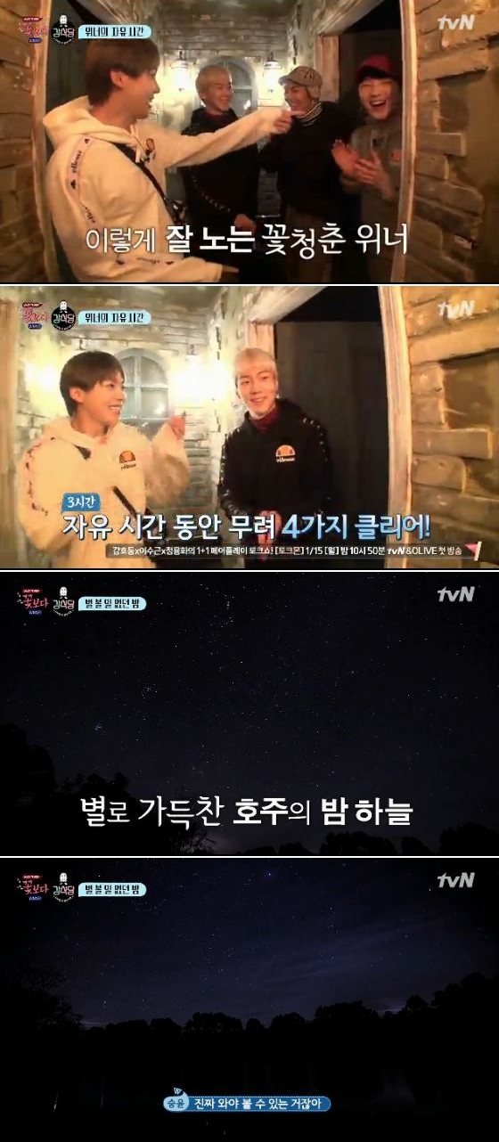 한편 뒤이어 서호주 여행을 떠난 위너의 뒷이야기가 공개됐다. 이들은 숙소 불을 모두 끈 뒤 별로 가득한 서호주의 밤하늘을 바라보며 감상에 빠졌다. "너무 로맨틱해"를 연발하던 강승윤은 '자기야 눈 감아봐'를 꼭 해보고 싶다며 즐거워했다.