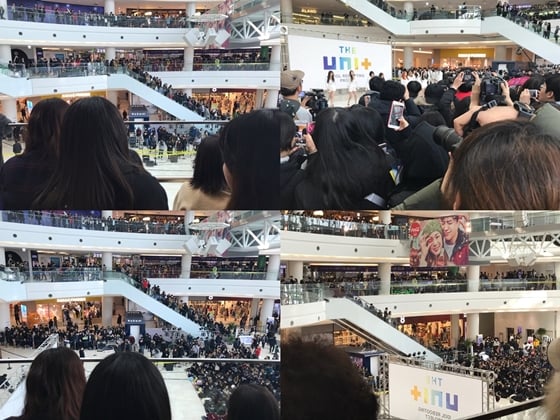11일 KBS 2TV '더유닛' 측은 서울 영등포구 타임스퀘어에서 남녀 최종 멤버 18명이 겔릴라 공연을 진행했다고 밝혔다.