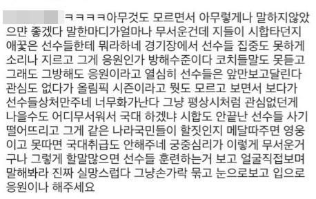해당 글 이후 네티즌은 국민의 응원을 방해라고 말한 점, 관심 없는게 나을 수도 있다라는 자극적인 말을 지적하고 있다.