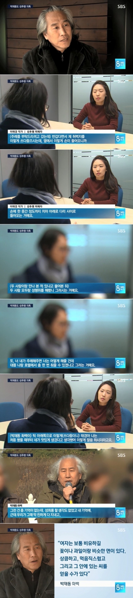 웹툰작가 이태경이 시사만화 거장으로 알려진 박재동 화백에게 성폭력 피해를 입었다고 주장하며 '미투'가 만화계까지 번졌다. 지난 26일 방송된 SBS '8뉴스'와의 인터뷰에 나선 이태경은 2011년 결혼을 앞두고 박재동 화백에게 주례를 부탁하려고 만났다가 성추행 및 성희롱을 당했다고 밝혔다. 박재동 화백은 오래된 일이라 기억이 나지 않는다며 부인한 상태. 박재동 화백은 앞서 교수로 재직 중인 한국예술종합학교에서도 성희롱적 발언으로 물의를 일으켰다가 학생들의 반발에 3차례 공개 사과한 이력이 있다.