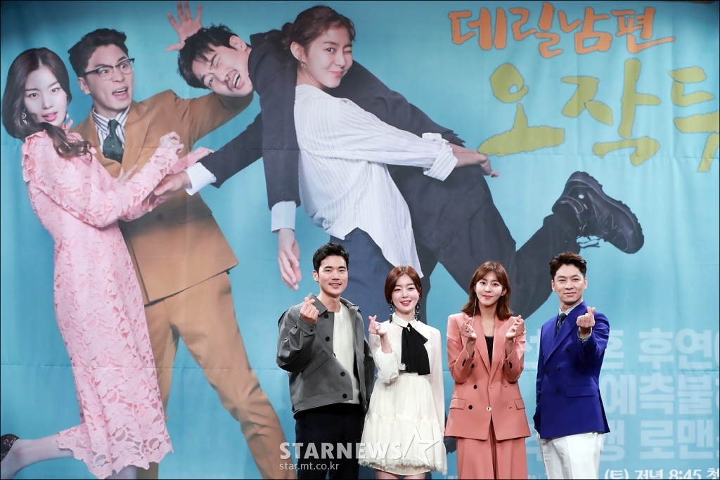 배우 김강우와 한선화, 유이, 정상훈이 2일 오후 서울 마포구 상암동 MBC 신사옥에서 열린 MBC 새 주말드라마 '데릴남편 오작두'(극본 유윤경·연출 백호민,제작 팬엔터테인먼트) 제작발표회에 참석해 포즈를 취하고 있다.'데릴남편 오작두'는 극한의 현실을 사는 30대 중반 직딩 솔로녀 한승주(유이 분)가 오로지 유부녀라는 소셜 포지션을 쟁취하기 위해 순도 100% 자연인 오작두(김강우 분)를 데릴남편으로 들이면서 시작되는 역주행 로맨스 드라마로 3일 저녁 첫 방송된다.