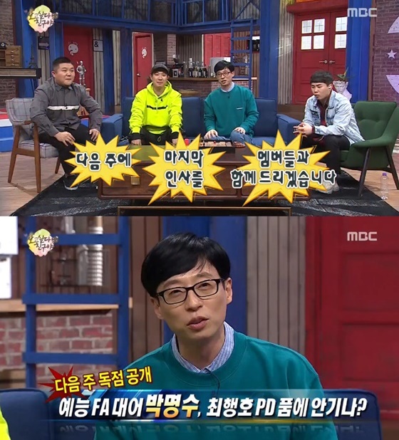 유재석이 MBC '무한도전'의 마지막을 언급했다. 24일 오후 방송된 '무한도전'에서는 '보고 싶다 친구야' 특집으로 꾸며졌다. 이날 방송을 마무리 하면서 유재석은 '무한도전'의 마지막을 이야기 해 눈길을 끌었다. 그는 "다음주에 마지막 인사를 멤버들과 함께 드리겠습니다"고 했다.