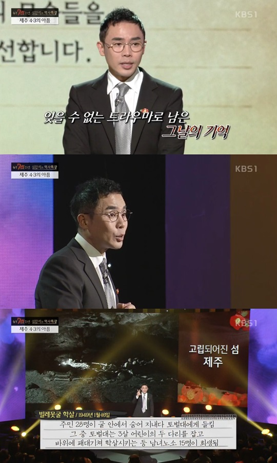 설민석은 3일 오전 11시 방송된 KBS1TV 특별 방송 '제주 4.3 70주년 – 당신이 몰랐던 제주 이야기'를 통해 제주 4.3 사건 피해자들의 사연을 소개했다. 제주 4·3 사건은 1948년 4월 3일부터 1954년 9월 21일까지 제주도에서 일어난 민간인 대규모 학살 사건이다.