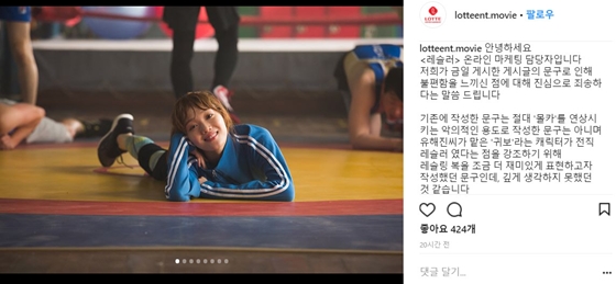 롯데엔터테테인먼트가 영화 '레슬러' 홍보와 관련해 자극적 문구를 사용한 것에 대해 공식 사과했다. 10일 오후 '레슬러' 배급을 맡은 롯데엔터테인먼트는 공식 인스타그램에 지난 9일 영화 홍보와 관련해 올린 게시물에 대해 사과의 뜻을 밝혔다.