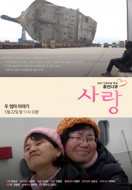 10년이 넘는 시간 동안 방송되며 MBC를 대표하는 브랜드 다큐가 된 '휴먼다큐 사랑'의 2017년 방송작 '두 엄마 이야기'는 세월호 실종자로 남아있었던 단원고 조은화, 허다윤 양을 기다리는 두 어머니들의 이야기를 담은 다큐멘터리다.