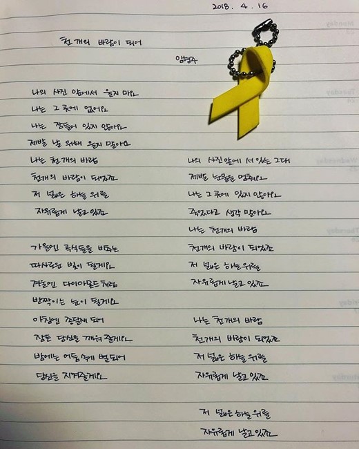 이상민은 16일 오전 자신의 SNS에 "리멤버, 2014. 4. 16"이란 글과 함께 노란 리본을 덧붙이며 추모의 뜻을 밝혔다. 공승연은 "세월호 4주기 잊지 않겠습니다. 며칠 전 라디오에서 이 노래를 듣고 잠시 멈췄습니다"라며 팝페라가수 임형주의 '천 개의 바람이 되어' 가사를 적어 올렸다.