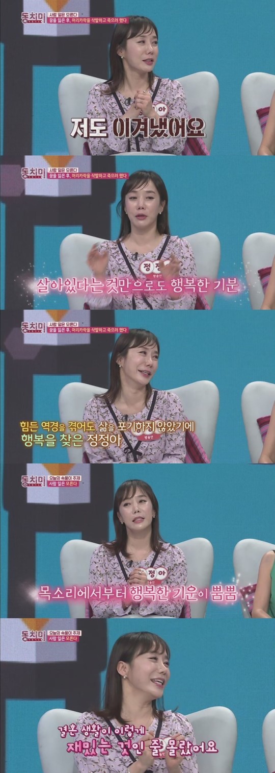 정정아는 "저 멀리서 오토바이가 오더라. 그래서 피했는데, 알고 보니 전조등이 한 쪽 고장 난 트럭이었다. 차가 폐차 될 정도로 큰 교통사고였다. 순간 기절을 했다가, 정신이 살짝 나면서 어디선가 찬바람이 휙 불었다. 그때 '너 죽고 싶다고 했지? 죽는 게 어떤 건지 느껴봤어? 어떻게 할래, 살래 죽을래?'라는 목소리가 들렸다. 그때 정말 힘든 일이 많아서 죽고 싶다고 생각했는데, 알고 보니 나는 살고 싶었더라. 그래서 '살고 싶어요. 저 살고 싶어요'라고 크게 소리쳤다"라고 말하며 폭풍 오열하는 모습을 보였다.