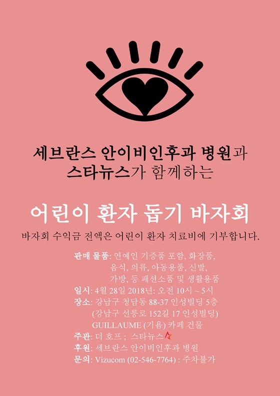 '어린이 환자 돕기 바자회'(주관 더호프, 스타뉴스·후원 세브란스 안이비인후과 병원)는 오는 28일 오전 10시부터 오후 5시까지 서울 강남구 청담동 인성 빌딩 5층(비주컴)에서 열립니다.