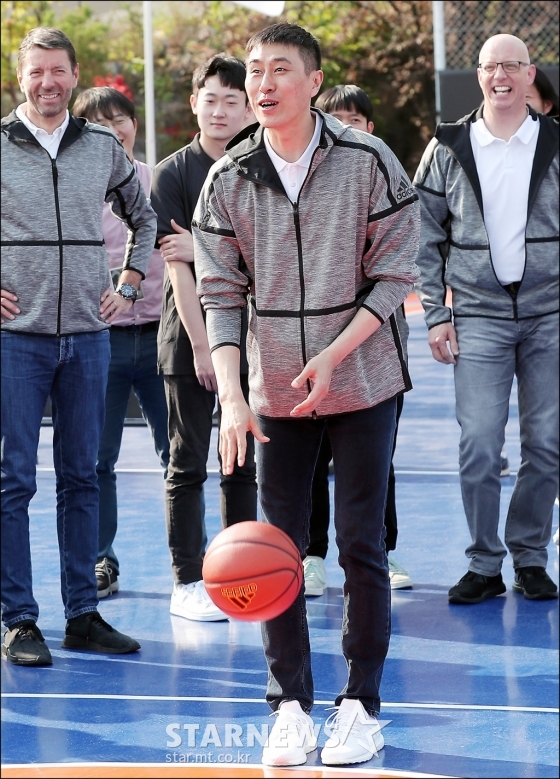 이상민 삼성썬더스 감독이 25일 오후 서울 성동구 응봉체육공원에서 열린 아디다스와 서울시가 함께하는 사회공헌 프로젝트 '스포츠로 세상을 변화시키다' 행사에서 시투하고 있다.